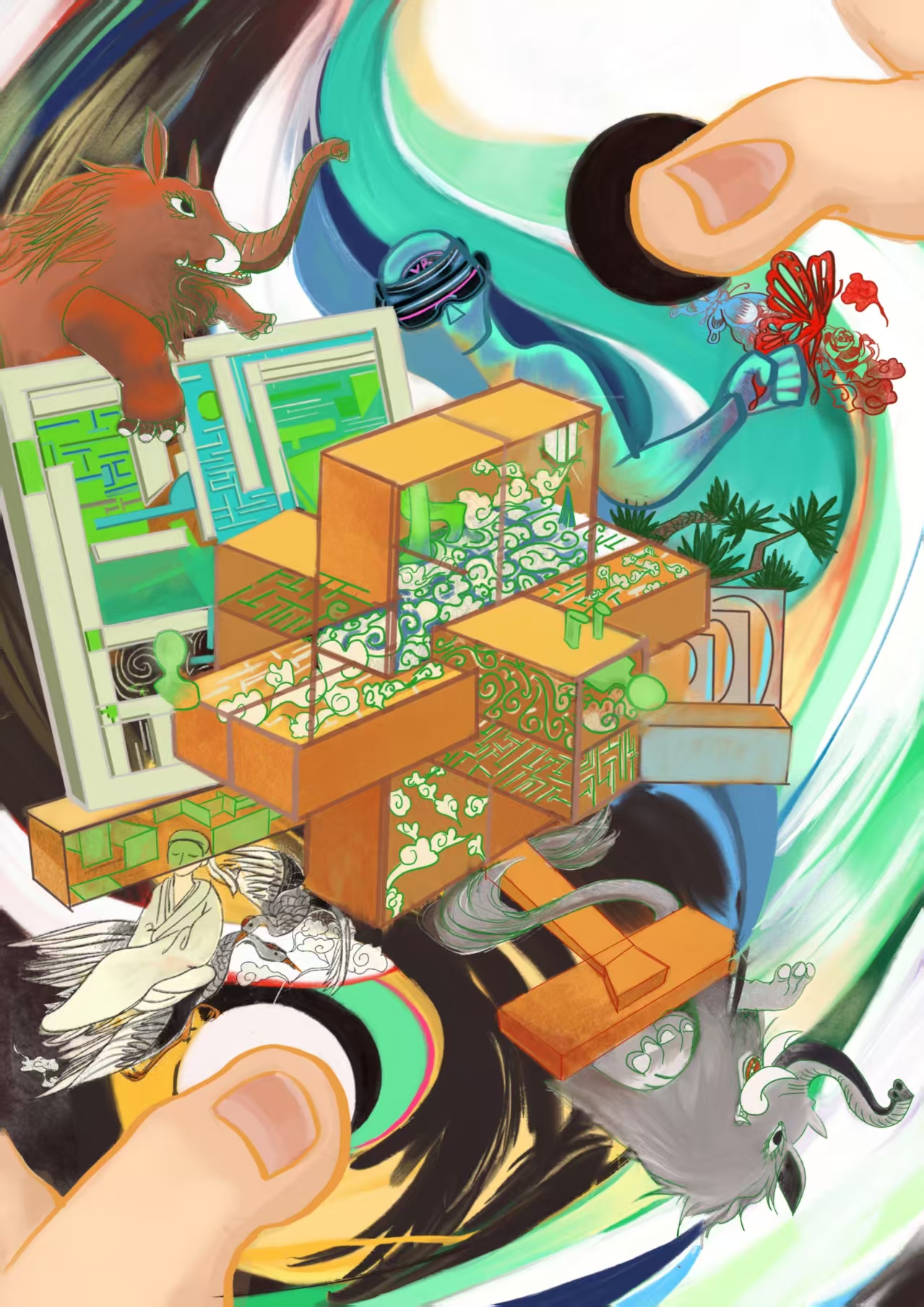 画作展现的是现代高科技产品和中国传解玩具的碰撞。核心是中间的鲁班锁和华容道,其内部是迷宫路。旁边的怪物是梦貘,在传说中它以梦位食,吞噬梦境。蝴蝶则是意味庄周梦蝶,什么是真什么是假,无从得知。而神话中骑着仙鹤的仙人也代表着不真实。玩家用vr玩游戏,游戏手柄化作阴阳两极。